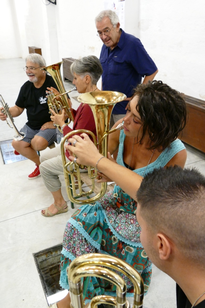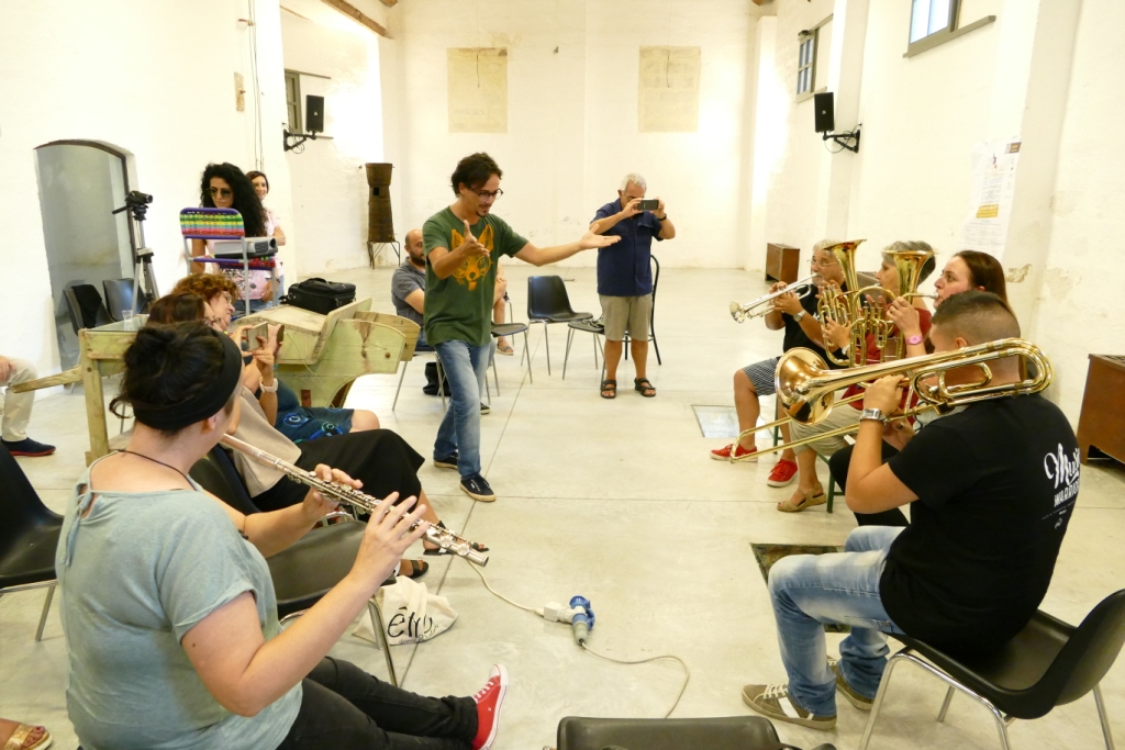 Questo laboratorio ha attraversato quasi tutte le giornate della nostra settimana, e ha visto impegnati tutti i musicisti performer che fanno parte della nostra squadra: Andrea Gargiulo, Luigi Mengoli, Martino e Matteo Pezzolla, Emanuele Raganato, Giuliana Gnoni. Assieme a loro abbiamo via via costruito tutti i momenti sonoro-musicali della performance finale.