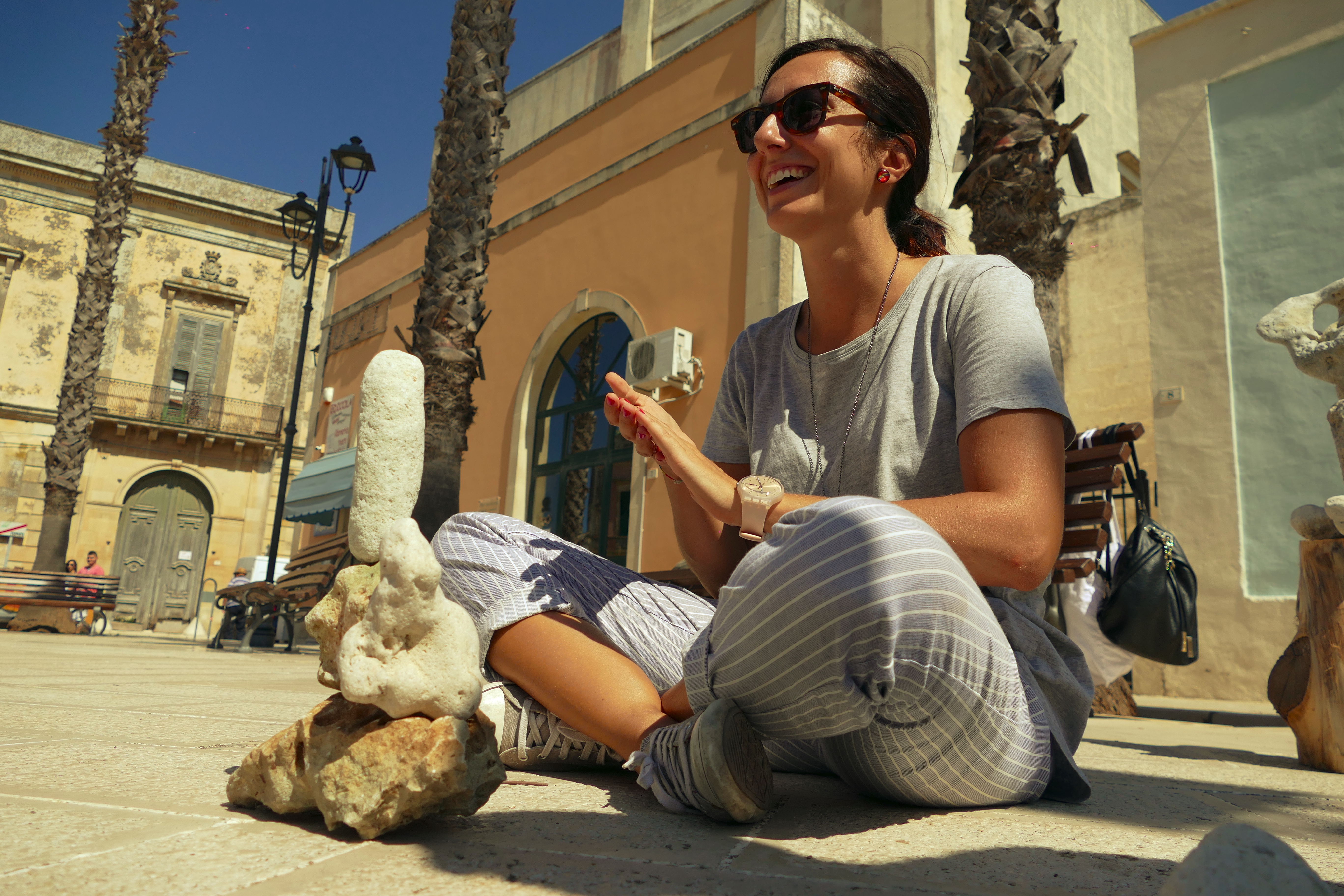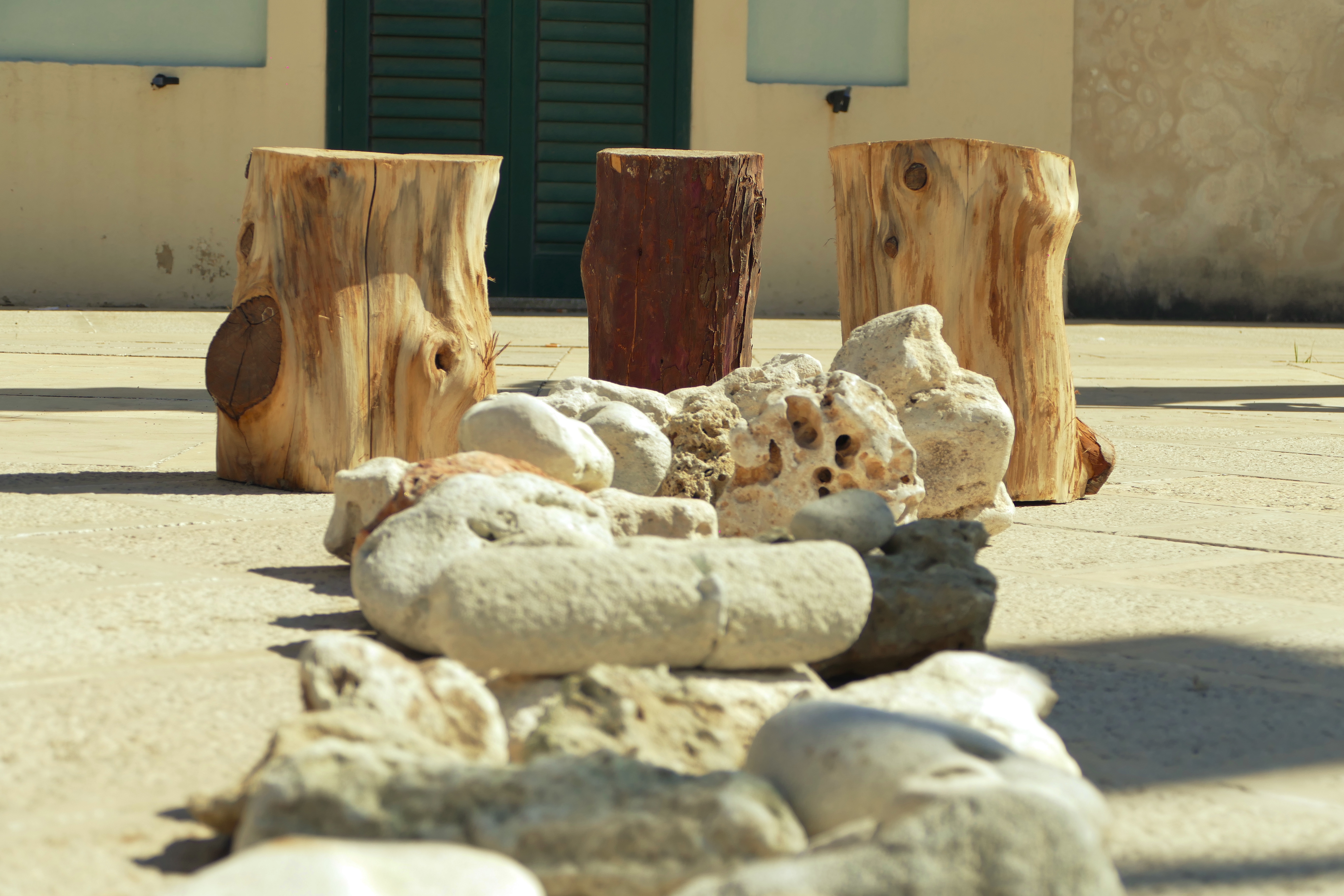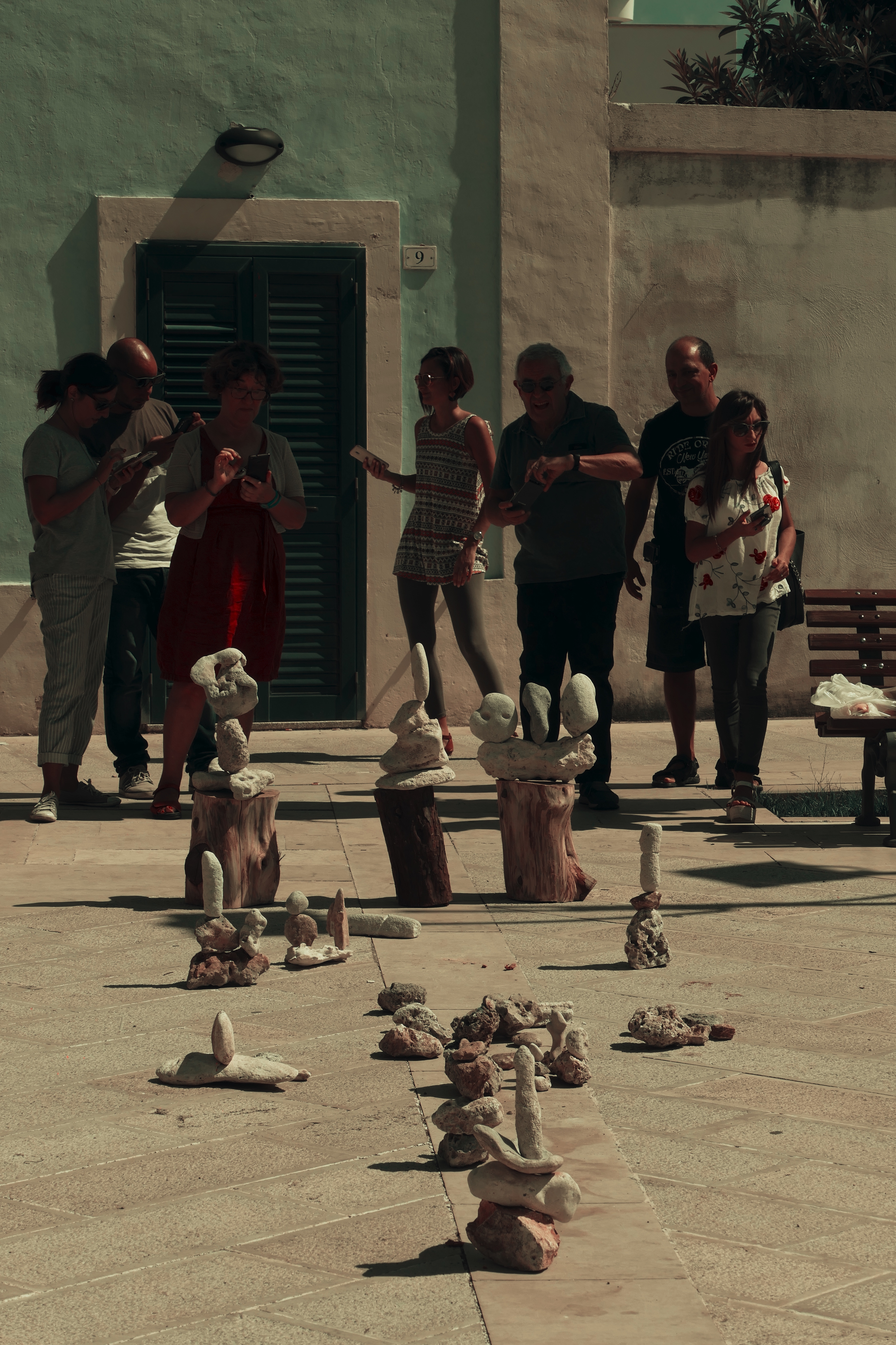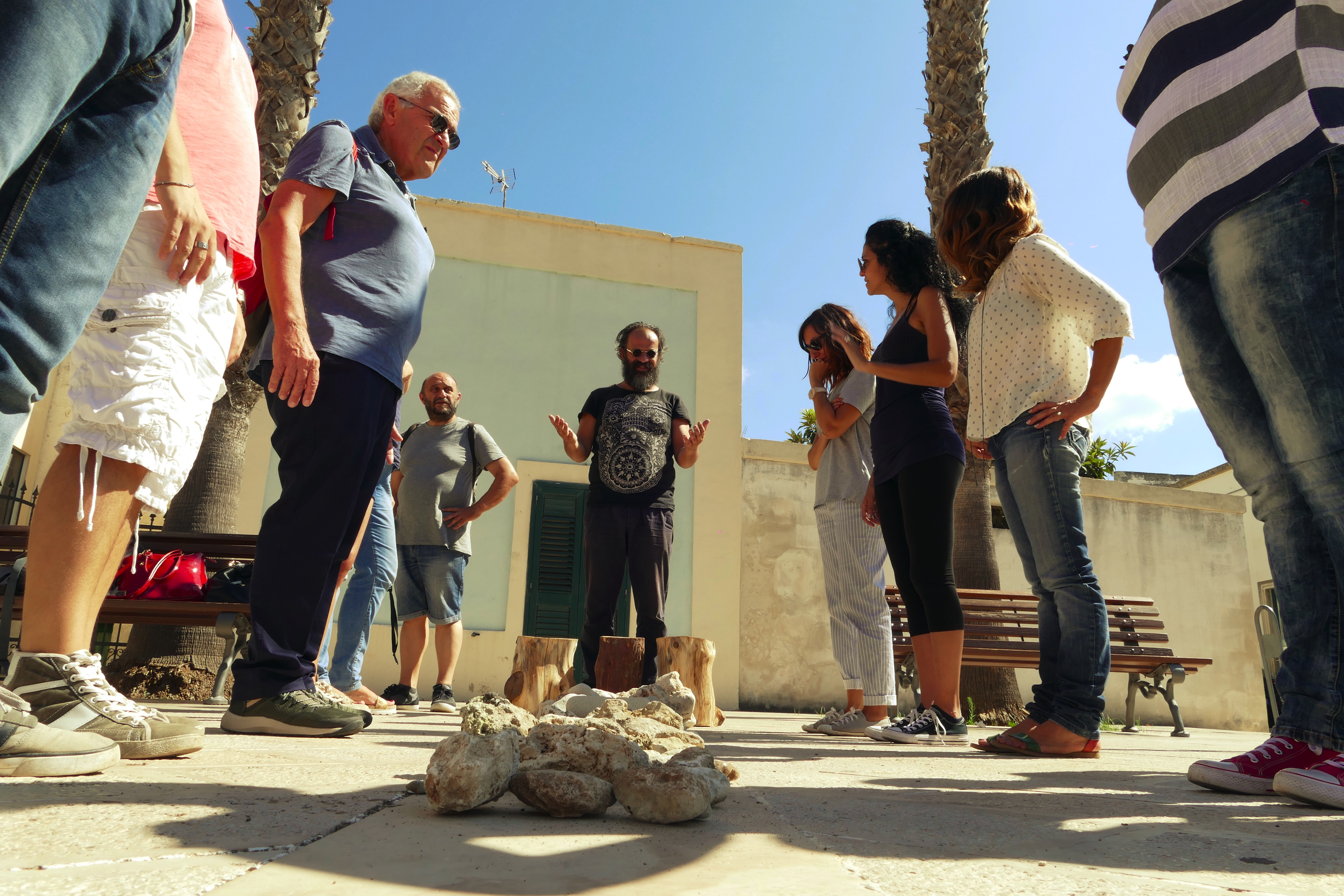Con Simone Franco abbiamo allestito delle piccole installazioni litiche, grazie alle pietre raccolte durante il suo laboratorio del 2 settembre. L’allestimento lo abbiamo fatto nella piazza principale del paese intendendo così portare il Parco Canali dentro il cuore di Ortelle, un gesto per noi altamente simbolico per congiungere creativamente periferie e centro, siti naturalisti e ambientali e spazi urbani in una continuità possibile.